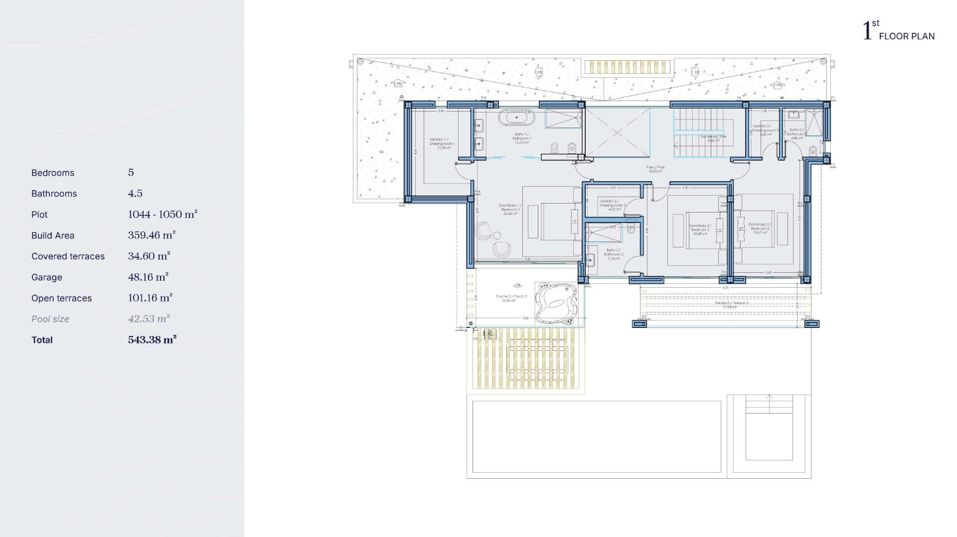 Każda rezydencja jest zbudowana na działkach o powierzchni ponad 1000 m² i rozmieszczona na dwóch poziomach, posiada 4 lub 5 sypialni, prywatne baseny i przestronne tarasy idealne do spędzania czasu na świeżym powietrzu. Niektóre wille oferują nawet zapierające dech w piersiach widoki na morze z górnego piętra. Zakończenie budowy planowane jest na początek 2026 roku, co daje Ci możliwość spełnienia swojego śródziemnomorskiego marzenia.