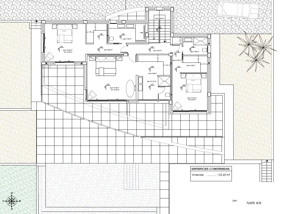 Następnie wchodzimy na wyższe piętro (133,65m2), gdzie znajdziemy 3 przestronne pokoje z ich łazienką en suite.